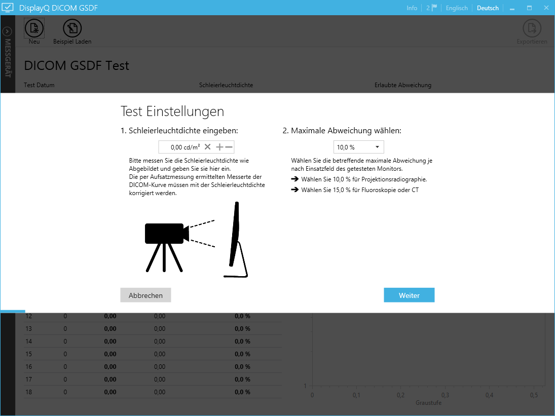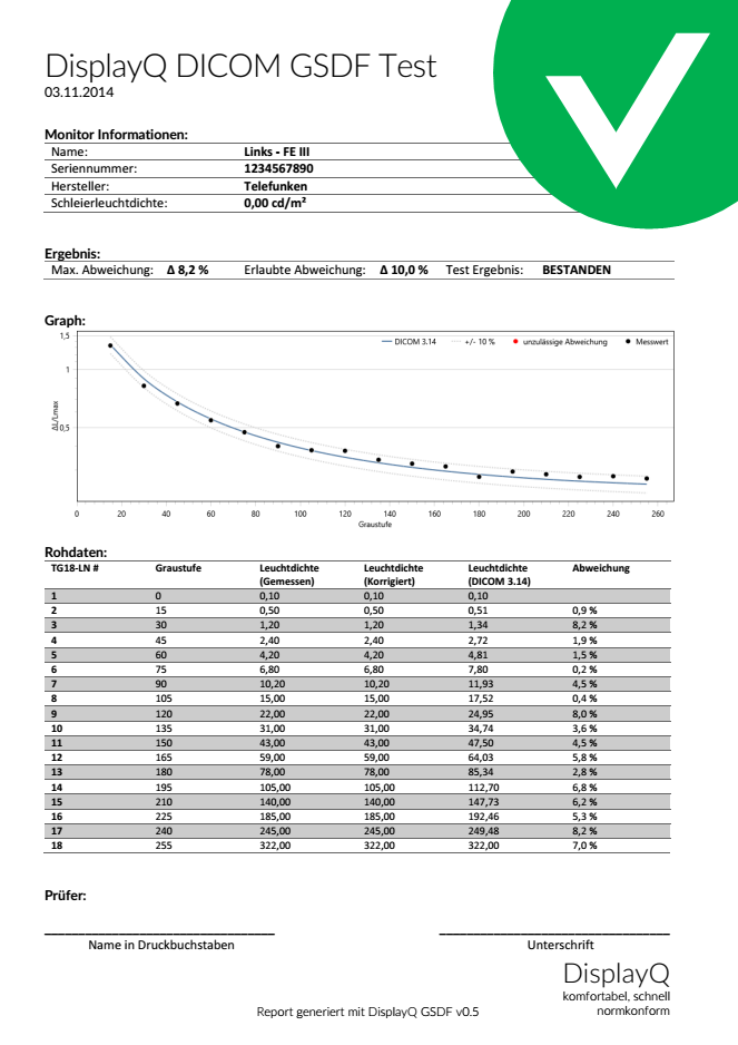 Mit dem Programm DisplayQ Expert DICOM-Curve kann die Leuchtdichte-Kennlinie (auch bekannt als DICOM-Kurve oder „Grayscale Standard Display Function“ – GSDF) gemessen werden und ein Bericht erstellt werden.